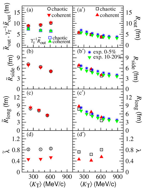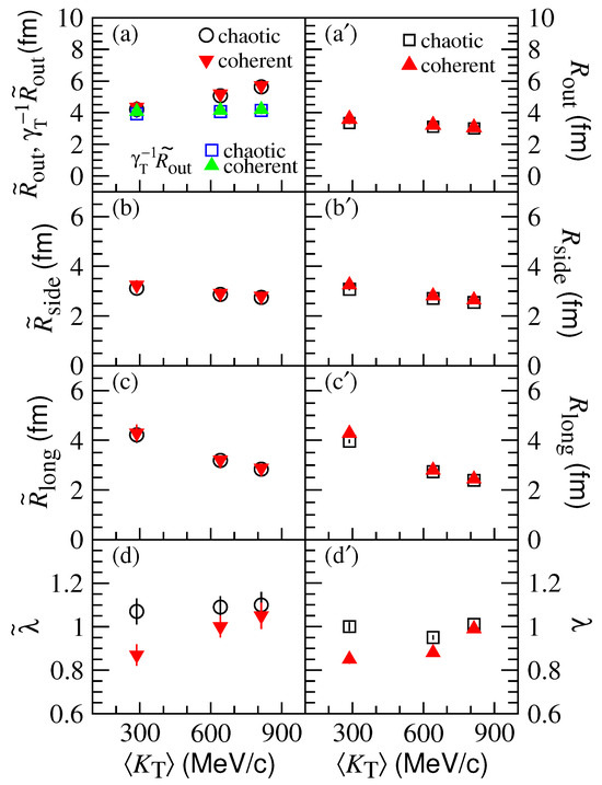 For the AMPT model, Figure 9a–d show the pion imaging results , , , and for the chaotic and partially coherent sources in Pb-Pb central collisions at TeV in the pair transverse momentum intervals, GeV (average GeV), (average GeV), and GeV (average GeV) in the laboratory frame. Figure 9a’–d’ show the fitted results of HBT radii , , , and the chaoticity parameter of the two-pion correlation functions for chaotic and partially coherent sources in the intervals. The correlation functions were calculated using the longitudinal co-moving system (LCMS) to compare them with the experimental data in Pb-Pb collisions at TeV at the LHC [14]. In the LCMS, the pion pair has a transverse velocity , leading to a Lorentz contraction of with the factor . In Figure 9a, the values of are shown for comparison with the fitted results using the LCMS.