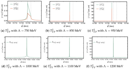 Line shapes of the transition amplitudes for the cutoff momentum (a) 750 MeV, (b) 850 MeV, and (c) 950 MeV in the sector, as well as (d) 1000 MeV, (e) 1100 MeV, and (f) 1200 MeV in the sector of the system. The relevant thresholds are indicated by dashed lines. In subfigures (a–c), the green line labeled and the red line labeled represent and , respectively.