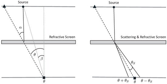 Imaging examples for (Left), the usual lensing geometry in the case of a refractive screen, and (Right), including both refraction and scattering. Similar to Figure 2, scattering broadens the apparent dimensions of the source.