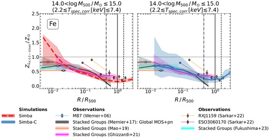 - Pearce, F.A.; Kay, S.T.; Barnes, D.J.; Bahé, Y.M.; Bower, R.G. Redshift Evolution of the Hot Intracluster Gas Metallicity in the C-EAGLE Cluster Simulations. Mon. Not. R. Astron. Soc. 2021, 507, 1606–1622. [Google Scholar] [CrossRef]
