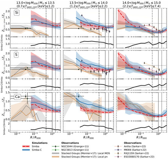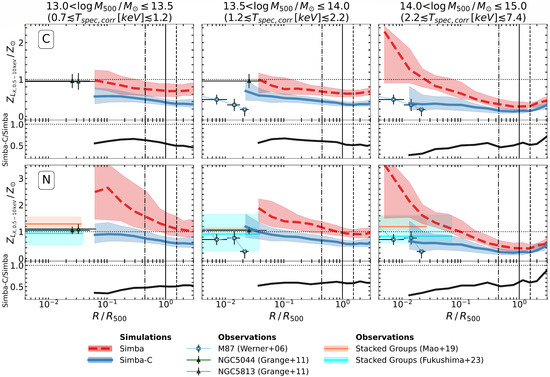 - On average, simba-c produces lower-amplitude projected -weighted abundance profiles than simba, with flatter profiles in the inner regions, particularly in high-mass groups but also in low-mass groups for some metals. These characteristics tend to be in better agreement with observations. The scatter within and across observational samples reduces their constraining power and sometimes allows both simulated samples to be consistent with observations. Additionally, in a few instances, simba matches observations better than simba-c. For example, in our intermediate-mass bin, the Fe, Si, and S profiles of simba-c have greater amplitudes than those of simba, resulting in its reduced agreement with observations.