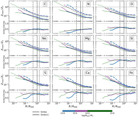 - We find that the simba and simba-c mass-weighted abundance profiles draw closer together with increasing atomic number. We connect this to the addition of HNe enrichment in the Chem5 model, which increases the production of Fe and elements (e.g., Si, S, Ca), enhancing their abundance profiles to “re-match” those of simba by approximately equaling the aforementioned overall decrease in metals in simba-c.