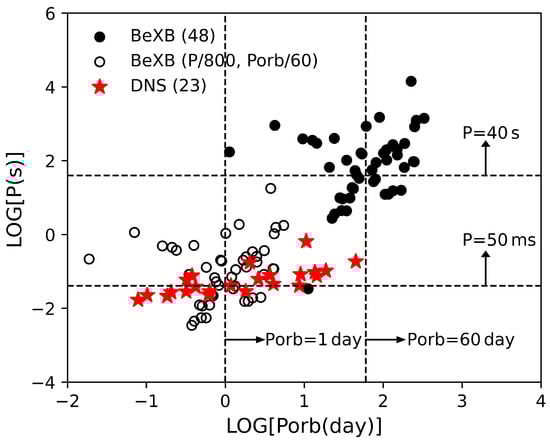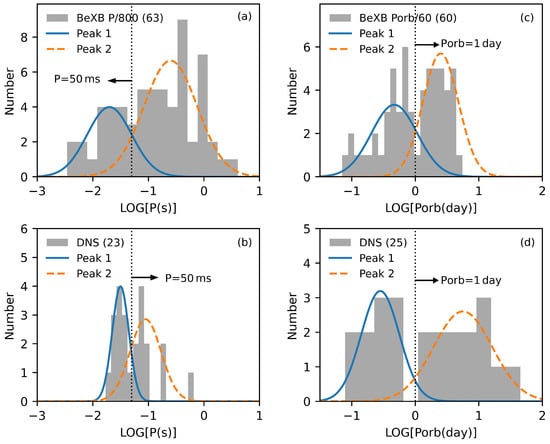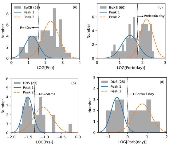 - In order to explore the evolutionary link between BeXBs and DNSs, we assume that Galactic BeXBs transfer the bi-modal P/ classifications to Galactic field DNSs through the accretion process. Moreover, we also assume that the Galactic BeXB group that corresponds to the short orbit sources ( days) of bi-modal classifications will preferentially evolve into the Galactic field DNS group that corresponds to the sources with a fast spin ( ms) and short orbit ( day) in the bi-modal classifications. Furthermore, we infer the spin (P values are scaled by ) and orbital ( values are scaled by ) contraction factors, which are inferred by the gaps ( s and days for Galactic BeXBs, and ms and day for Galactic field DNSs, as can be seen in Figure 2) showing the bi-modal classifications of the two types of sources. It can be seen from Figure 3 that the scaled P and values of Galactic BeXBs and Galactic field DNSs show similar positive correlation trends in the relation. In addition, it can be also noticed from Figure 4 and Table 2 that the scaled P and values of Galactic BeXBs share the similar bi-modal distributions to those of Galactic field DNSs. It is noticed that these contraction factors of P/ values are derived in a statistical way, which may cause uncertainties due to the limit of the sample numbers. In fact, it can be seen from Figure 4a,b and Table 2 that the two peaks of bi-modal P distributions of scaled Galactic BeXBs and Galactic field DNSs are not quite symmetric, which may be due to influence of the binary accretion-induced spin-up evolution. Moreover, the contraction of NS spin and binary orbit from Galactic BeXBs to Galactic field DNSs may be also affected by other physical factors. In fact, it is indicated by Zhou et al. [50] that BeXBs with short orbits of days on average share faster NS spin periods, lower NS magnetic field strengths [18], lower binary orbital eccentricities, and more high energy outbursts (Type II outbursts) with higher average peak X-ray luminosities than those sources with longer orbits of days. Moreover, Zhou et al. [50] also indicated that DNSs with short orbits of day on average share faster NS spin periods, higher spin-down powers, and higher binary accretion rates than those sources with longer orbits of day. Therefore, the potential evolution relation and channels from BeXBs to DNSs may need further observation confirmation and theoretical analysis, e.g., the larger samples, and the detailed modeling of binary evolution. However, the inferred contraction factors of P and can offer a reference for the binary evolution from BeXBs and DNSs, which can also offer a tool to trace the classification of the two types of sources.