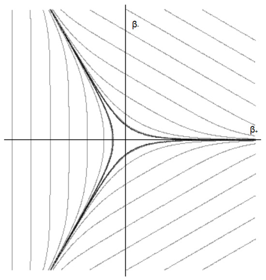 This term defines a closed potential well with exponentially steep walls and the symmetry of an equilateral curvilinear triangle with open corners at infinity, as we can see in Figure 1. In addition, potential walls move outward while approaching the cosmological singularity (), due to the term in (2).