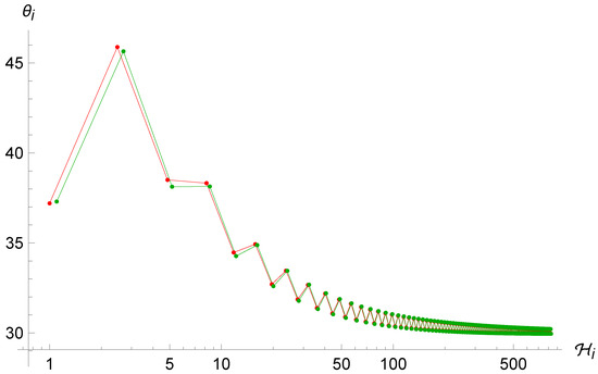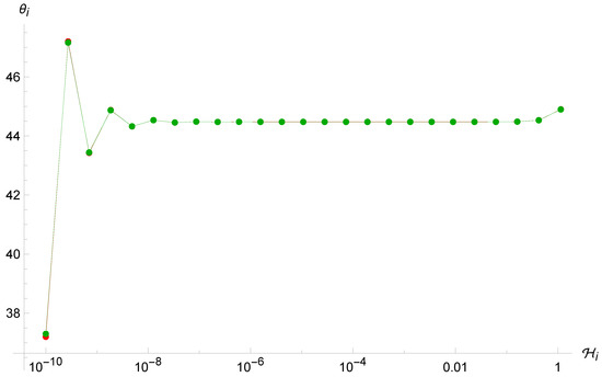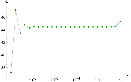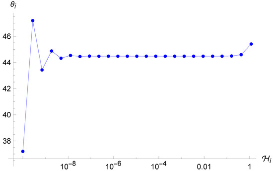 In particular, it is even more evident in this case the ergodicity is completely lost with respect to the Brane Algebra scenario (see Figure 6, Figure 7 and Figure 8). As anticipated above, the system tends again to oscillate between two very close values of , even with very different choices of initial conditions, before stopping after a finite number of iterations when the term is of order unity, which makes the point-universe velocity very small. Furthermore, we see again that there is an attractor value, this time at . This is probably due to the fact that in order to observe enough reflections, we must give a very small initial condition for ; therefore, we can expand the arctangents around zero and simplify the map (41), which for yields , and thanks to (33), the next will again be around .