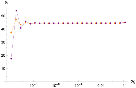 Also in this case, the point universe follows oscillatory trajectories before settling into the final uniform rectilinear motion until the singularity is reached. In particular, the ergodic property of the standard motion (see Figure 2) is lost, since trajectories related to similar initial conditions remain close to each other. Analogously to the loop case of Section 4.2, here, we also find an attractor at . This is to be expected because the hyperbolic arctangents of the map (45) have the same leading-order behavior for very small arguments of the loop map (41), and therefore, the chain , , is also reproduced here.