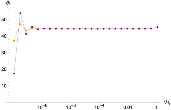 where and are the incidence and reflection angles computed with respect to the potential wall’s normal. This reflection law is equivalent to the so-called Belinskii–Khalatnikov–Lifshitz (BKL) map for the Kasner indices that appears when using directional scale factors instead of Misner variables [32,40]. Here, we will use the acronym BKL to refer interchangeably to both the reflection law and the BKL map.