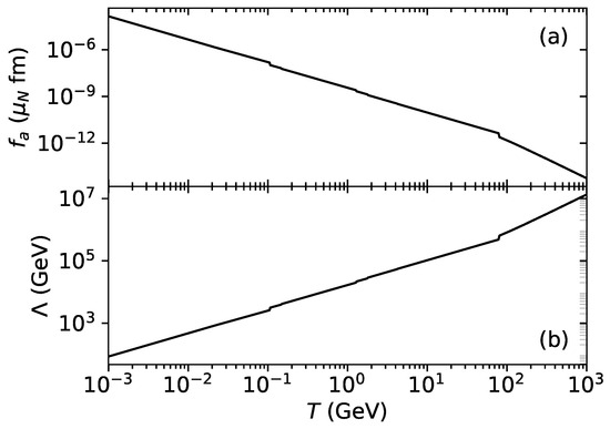(a) In the top panel, the curve plots the anapole moment at which the spin–flip rate of a non-relativistic Majorana fermion equals that of the Hubble parameter for a given temperature in the radiation-dominated era of the early Universe. (b) Setting with , the curve in the lower panel shows the energy scale at which the spin–flip rate of a non-relativistic Majorana fermion equals that of the Hubble parameter for a given temperature in the radiation-dominated era of the early Universe. Note: The curves in (a,b) are not smooth because we treat the relativistic degrees of freedom as a piecewise continuous function of the temperature. A more detailed calculation would have little impact on our results.