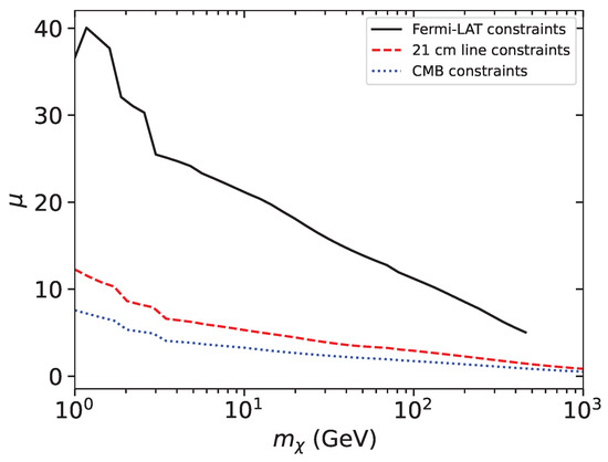 We use these constraints on the s-wave cross section to place lower bounds on the parameter in Equation (2). To do so, we assume that, for a given DM mass , the energy-scale is set by reproducing the DM relic density through p-wave annihilation only, fixing all parameters in the s-wave cross section except . Then the limits on two-photon annihilation from Fermi-LAT, the CMB, and 21 cm data bound as shown in Figure 3. We emphasize here, again, that the p-wave mode is the primary annihilation channel, and the s-wave mode contributes in a subdominant manner. For instance, we can see in Ref. [54] and elsewhere that DM candidates which annihilate primarily through the s-wave channel have been excluded for masses below 20 GeV; however, this particular bound is does not exclude the DM candidates under consideration herein because such low mass candidates in our work would annihilate primarily through the p-wave mode with the s-wave mode suppressed sufficiently to avoid the constraints from Refs. [52,54,55].