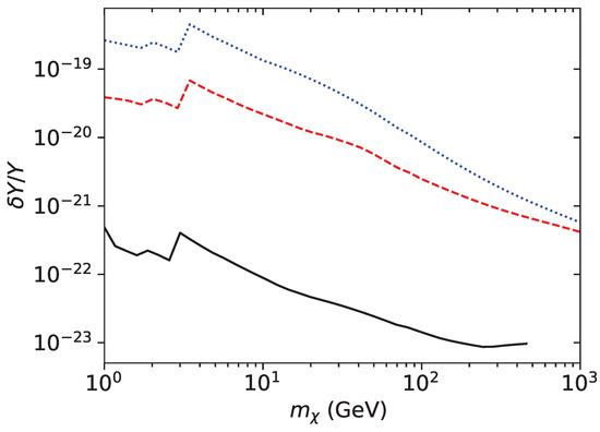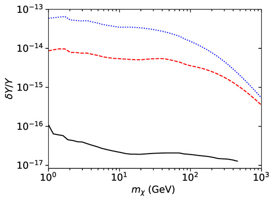 For parameters, we set GeV. Annihilation dominated by the p-wave process reproduces the observed DM relic density for GeV with a freeze-out temperature around . If we use the most stringent constraints on derived from the Fermi LAT data [52], then . From the estimate in Equation (23), we expect a fractional increase in the relic DM density of 0.4% for a fully polarized DM medium. Numerical calculations produce the same order of magnitude change. Computing for both scenarios, we find that the p-wave only (full polarization) relic density is a factor of 0.1% larger than when both p- and s-wave annihilations (no current scenario) are considered. (We note that the estimate of from Equation (22) relative to the numerical computation of differs by 3.5%; however, the relative fractional change in the estimates using Equations (16) and (22) for the p-wave only and p- and s-wave computations for yield the correct order of magnitude result.)