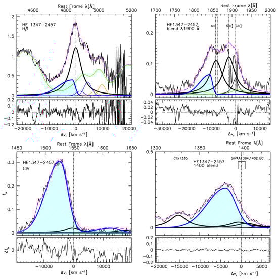 Rest-frame emission line profiles of H, 1900Å blend, Civ1549, and Siiv1397+Oiv]1402, for the HEMS quasar HE1347-2457, after continuum subtraction. The dominance of the outflow emission is emphasized by the cyan shade of the blueshifted components, weakest in the H profile, but overwhelming in the high ionization lines. The quasar rest frame is identified by the dot-dashed vertical line. The virialized components are traced by the thick black lines, at systemic redshift, being extremely weak in the case of the high-ionization Civ1549, Siiv1397, and Heii1640 lines. The Heii1640 line has been fit self consistently with Civ1549. The H line is strongly affected by Feii emission (green line), with .