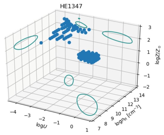 Estimate of physical parameters for the HEMS quasar HE 1347-2457: metallicity Z, density, and ionization parameter. Dots represent photoionization simulations in the parameter space that are in agreement with the minimum within confidence limit. The seagreen lines trace the projection of the confidence limits in the three parameters after smoothing with a Gaussian kernel.