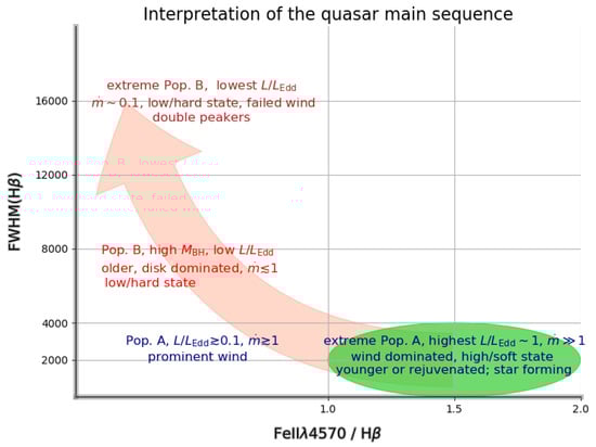 The main sequence (MS) is a classification scheme that organizes quasars according to their spectral properties, much like the main sequence of stars [,,,]. The MS is most commonly represented in the optical plane (Figure 1, see [] for an alternative), defined by two parameters: