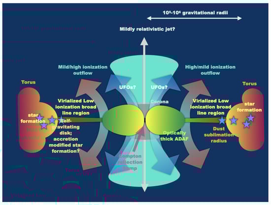 The sketch of Figure 10 illustrates the structure and components of SE AGN focusing on the regions surrounding the supermassive black hole (from 1 to –) gravitational radii. At the center, the SMBH is enveloped by an ADAF. A mildly relativistic jet may emerge from the black hole along the spin axis, indicating the outflow of material along the polar axis [,,]. The sketch also highlights the presence of a corona above and below the accretion flow, which is responsible for high-energy X-ray emission. The geometry of the corona is actually highly uncertain, with a lamppost geometry usually preferred over a more symmetric configuration [,]. A “special” Compton reflection hump representing the interaction of high-energy photons with Compton-thick outflowing material from the very edge of a geometrically-thick accretion disk might be also present: in this case, the emission of Fe K is seen displaced by (0.1–0.2) c [,]. Ultra-fast outflows (UFOs []) are indicated as the inner arrows extending outward from the central engine. The location and the geometry is not fully clear as yet [,,], but they are believed to be on a scale of – gravitational radii, perhaps closer to the SMBH axis than the mildly ionized outflows, which might be associated with the outer ADAF but also with the part of the disk not dominated by radiation pressure (shown as a flatter section in between the ADAF and the torus), shielded (at least in part) by the coronal X-ray radiation. The flattening shown in Figure 10 may not actually occur; however, the thick disk geometry allows for a shielded region (region II of Wang et al. []). Among the mildly ionized outflow, there is an interesting relation between the amplitude of the line blueshift and the ionization potential of the parent ionic species: highest blueshifts in Civ1549, ≳1000 km s−1 correspond to moderate blueshifts in Aliii1860 the ones of Civ1549 [], and of a few hundred km s−1 in Mgii2800 []. The decreasing velocity could be a consequence of an increase in the launching radius of a radially-stratified wind. Extrapolating the trend to higher energy, one should ascribe the X-ray high speed wind to the innermost region exposed to funnel radiation.