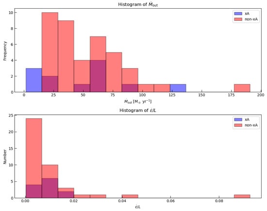 Sulentic et al. [] and Fraix-Burnet et al. [] list several multifrequency parameters that are systematically different between Population A and B. xA sources can be thought as simply reaching the most extreme values in most observational parameters of Population A. One of the main distinctions is the Civ1549 blueshift measured at half peak intensity ( Civ1549) with respect to the quasar rest frame, which is typically largest in xA (in absolute value, ≳1000 km s−1) compared to the smaller and null values in the rest of Population A and Population B ( to km s−1 [,,,]). xA quasars often show extremely weak Civ1549 and [Oiii]4959,5007 emissions compared to Population B, where these lines are more prominent and with a narrower core close to rest frame [,]. The [Oiii]4959,5007 lines are found blueshifted by several hundred km s−1 among xA (the so-called “blue outliers” [,,]), with shifts that are apparently correlated with those of Civ1549 [,,,]. Additionally, extreme Population A quasars tend to have softer X-ray spectra with large Röntgensatellit (ROSAT) photon indices (; ) [], while Population B shows somewhat rarer instances of enhanced soft X-ray emission. A indicates a flattish SED as observed in RL and Population B sources; a steeper slope is common among Population A sources, with the most extreme values, , among xA AGN. Such large values diagnose a soft X-ray excess [,,,] due to the presence of a component superimposed on an ideal power law connecting the near UV emission and the X ray domain, the parameter []. The most widely accepted explanation is emission from a Compton-thick corona connected with the innermost accretion disk ([,,], and references therein)] and possibly even with the bare accretion disk (i.e., without a Comptonizing corona []).