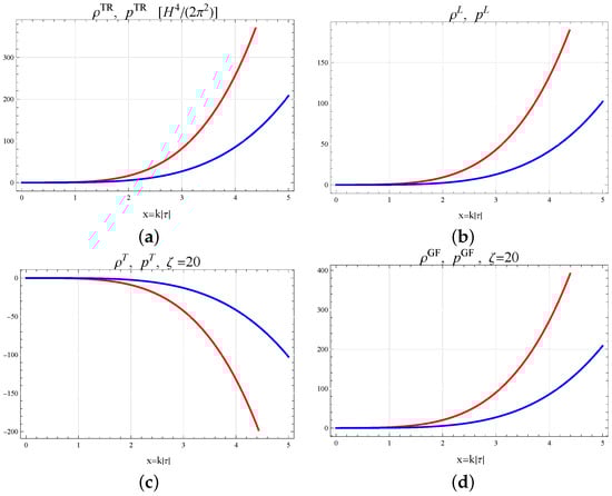 also depending on through in the mode . Since both the temporal and GF stress tensors are formed from , they become effectively the massless in the Landau gauge , as mentioned earlier below (31). Figure 1d shows that the unregularized and are UV divergent, at high k. The expressions (87) and (88) are not the same as that of a minimally coupling massive scalar field []. The GF stress tensor does not respect the covariant conservation