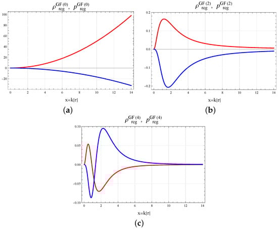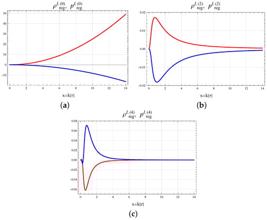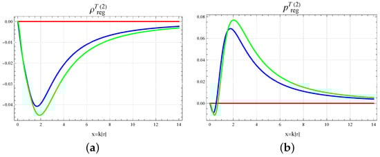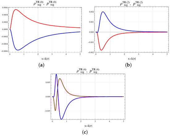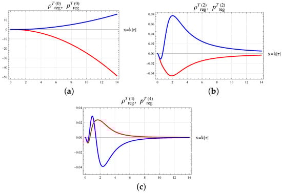 The regularized transverse spectral energy density (red) and spectral pressure (blue). (a) The 0th-order is UV convergent and positive. (b) The 2nd-order . (c) The 4th-order shows a negative segment. For illustration, , , and have been used.
