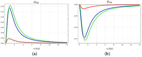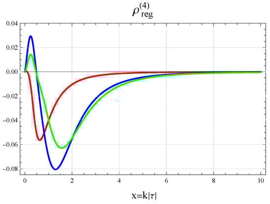 The Stueckelberg vacuum stress tensor given in Section 3 is UV divergent at high k. In the literature the 4th-order regularization was adopted by default [,,,,] on the stress tensor of a massive vector field. We shall assume the minimal subtraction rule that only the minimum number of terms should be subtracted to yield the convergent stress tensor []. Since the four parts of (91) and (92) actually have different UV divergences, we shall regularize each part, respectively, to its pertinent order. With this scheme of regularization, we shall be able to get a regularized stress tensor with the following desired properties: (1) UV and IR convergent, (2) the covariant conservation is respected, and (3) a nonnegative total regularized energy density. We emphasize that a positive energy density is required by the de Sitter inflation, as it is the source of the Friedmann equation. In the following, we present the details of regularization on each part.