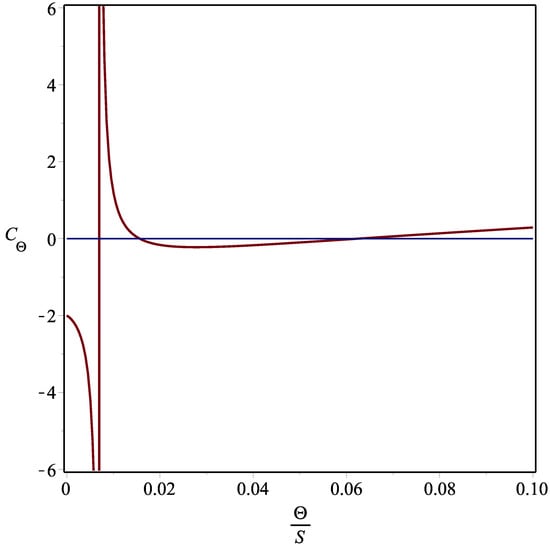 an expression that diverges for , indicating the presence of a second-order phase transition. Indeed, the divergence shows that the black hole transitions from a state with negative to one with positive heat capacity, which is interpreted in classical thermodynamics as a transition from an unstable to a stable state.