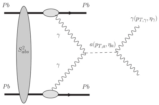 The production of axion-like particles in UPCs and its decay into a two-photon system is represented in Figure 1. The associated cross-section can be estimated using the equivalent photon approximation [24,27], which implies that the total cross-section can be factorized as follows: