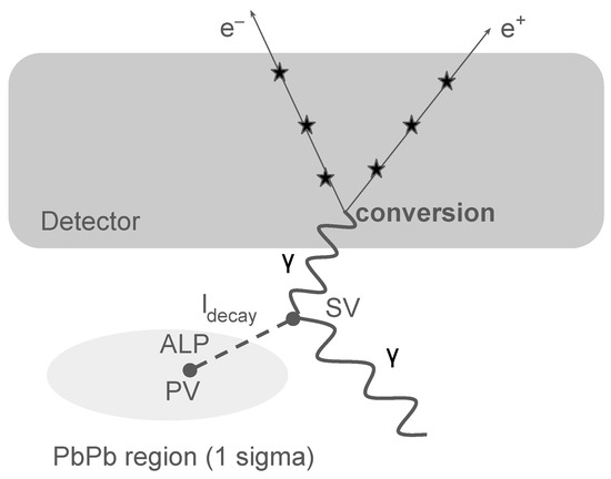 As discussed in the introduction, our focus in this paper is on ALPs with small masses, which generate a diphoton system in their decay. A shortcoming to separate the ALP signal in this region is associated with the fact that the diphoton low-mass spectrum has several standard model background sources such as , and [15]. Given the values for the cross-section associated with the ALP production, these sources of background obscure the ALP signal in this kinematical region. To address this challenge and establish a distinct signal region, one promising strategy involves probing ALPs that decay into photons outside the primary vertex luminous region (PV), followed by their conversion into an electron–positron pair. Figure 2 depicts this search strategy. The basic idea is that the reconstructed converted photons can subsequently identify a displaced secondary vertex situated beyond the lead–lead luminous region, differently from the SM light mesons that decay inside the luminous region. In this scenario, the decay rate of an ALP into two photons is determined by its mass and the magnitude of the ALP–photon coupling as follows [4]:
