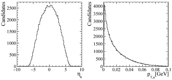 Distributions of (left) pseudorapidity and (right) transverse momentum of ALP candidates with GeV.