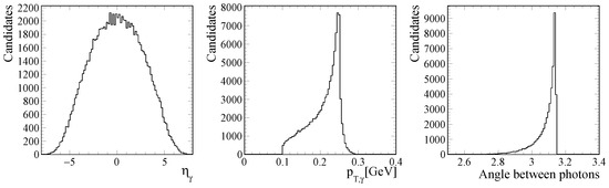 In order to estimate the ALP production in UPCs with the experimental requirements described in the previous section, we will use the SuperChic v4.03 event generator [32]. The ALP candidates will be generated in lead–lead collisions assuming a center of mass energy of TeV and that they have masses in the range of 0.2–1 GeV. Following Ref. [32], we will assume that the photon spectrum can be expressed in terms of the electric form factor and that the absorptive corrections for interactions can be estimated taking into account the multiple scatterings between the nucleons of the incident nuclei, which allows us to calculate the probability for no additional ion–ion rescattering at different impact parameters. The pseudorapidity and transverse momentum of an ALP candidate with GeV is shown in Figure 3. One has that the pseudorapidity distribution is larger for central rapidities and the transverse momentum distribution peaks at small , which is expected since the incoming photons, emitted by the lead ions, are characterized by very small transverse momenta [24]. Taking into account the ALP decay into a two-photon system, the resulting photons will also be mainly produced at central rapidities and transverse momentum of the order of 0.22 GeV, as shown in the left and central panels of Figure 4. In addition, the result presented in the right panel, indicate that the photons will be back-to-back in the transverse plane.