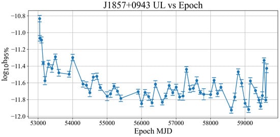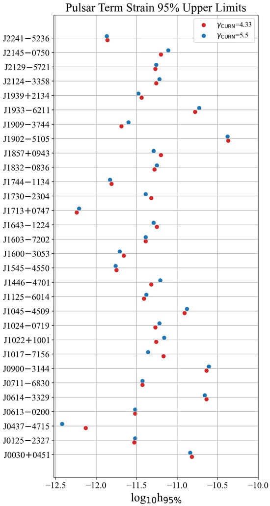 The upper limit is determined by setting the width at days, and then we calculate the upper limit h for the pulsar term using Equation (10). It is evident that the pulsar-term upper limits are not significantly influenced by the selection of spectral index for the majority of pulsars.