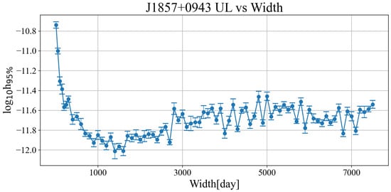 The constraints on h can be expressed as a mathematical function that depends on the epoch, width, and sky position. Only the width has a physical significance, which is equivalent to the loop size of the cosmic string. In Figure 4, we obtained the upper limit h as a function of the width for PSR J1857 + 0943. The early- and late-time bursts lack credibility due to insufficient data available prior to or following the occurrence of these bursts, which hinders the ability to accurately determine their amplitude. As the width increases, the constraint on h becomes more stringent since the timing residuals caused by the GWCSs increase as the event duration increases. In Figure 4, the upper limit h is a function of the width. As width increases, the strain amplitude h decreases, then increases, and finally plateaus. The limitation is strongest when the width is about 1200 days and the upper limit is about .