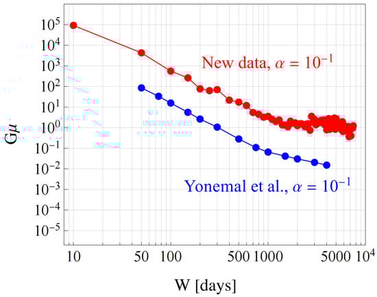 Figure 6 presents the constraint on the cosmic string tension as a function of burst width W, derived from the single-pulsar dataset of PSR 1857 + 0943, alongside the results from [21]. The in Figure 6 represents the size of the primordial string loop, and here, we compare the cosmic string tension limit specifically for = 0.1. As shown in Figure 6, the upper bound becomes more constraining for larger W due to two factors. First, as shown in Figure 4, the upper bound improves for larger W. Second, larger loops produce stronger GW amplitudes but have lower number densities. While the former enhances detectability, the latter reduces it. Considering both effects, we find that the former effect dominates, and that larger loops, equivalently larger W, are easier to detect, leading to tighter constraints.