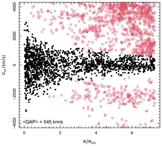 Data were obtained from the Sloan Digital Sky Survey (SDSS), Data Release 15 (DR15). Objects were selected within a radius of 550 arcminutes from the center, which is located approximately 194.95° in right ascension and 27.97° in declination, corresponding to the peak of the X-ray emission as observed by the Chandra X-ray Observatory e.g., [14]. Furthermore, the selection was made within a velocity range of 4500 km/s around the cluster velocity, km/s (or . Membership was determined using the shiftgapper method, which involves iteratively grouping galaxies based on their velocity and position [15,16]. This method effectively identifies cluster members by removing interlopers, using gaps in the velocity distribution to distinguish between cluster members and field galaxies in multiple radial bins. This approach is particularly effective in the outer regions of galaxy clusters, where interlopers (field galaxies or those from other clusters) can contaminate the sample. The method can be summarized as follows: