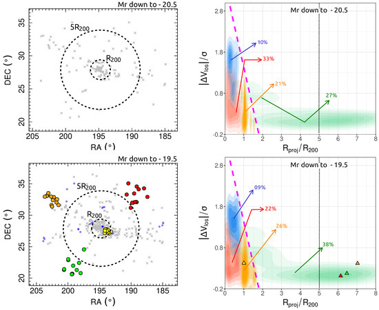 Next, probing the hierarchical dynamics using galaxies up to not only confirms the previous substructures but also includes other groups with equal statistical confidence (top panels of Figure 3). We see in these panels that most of the newly discovered substructures are present in the infall region of the cluster (green region), seven of them beyond the turn-around radius, and four that can be considered infall subgroups. In the central zone of the PPS, we note that the substructure previously identified in the backsplash region gains new galaxies and is now reclassified as being in the infall region. On the other hand, a new substructure in the backsplash region is found (in purple). The two-sample proportion test indicates the demographic similarity between the samples with and . Table 2 shows the properties of the substructures found by DS+.