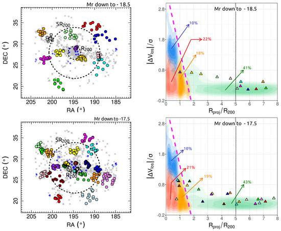 Finally, we verify the evolution of the substructures in Coma for galaxies with magnitudes limited to , corresponding to the faint end of the luminosity function including galaxies generally classified as dwarfs or low luminosities, e.g., [33]. We note a significant increase in the number of substructures compared to the previous cut, from 12 to 22 in total. The final count of substructures in Coma is presented in the bottom panels of Figure 4 and Table 3. Despite this increase, the demographics in the PPS regions do not change, according to the proportion test at the 95% confidence level. However, if we compare the first infall region between the first cut () and the last cut (), we see a significant increase in the occupation of this part of the PPS from 27% to 43%, reinforcing how much the periphery of the cluster is more affected by the low-flux population. It is also important to highlight the increase in the number of substructures within the line that separates objects with more than 1 Gyr in the cluster potential. In other words, low-flux galaxies contribute significantly to the dynamic characterization of the cluster, especially because more central substructures are those that actually indicate how regular or not the system is.
