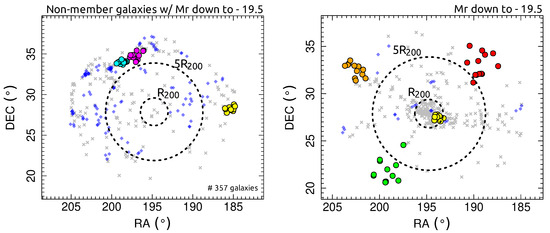 Comparison of the substructure identification regions for samples limited to . The left panel shows the detection of substructures using DS+ in the sample of 357 non-member galaxies, while the right panel presents the detection in the member galaxy sample, applying the same magnitude limit. The colors between the substructures in both graphs obviously do not represent the same subgroups. The symbols are the same as already explained in Figure 3.