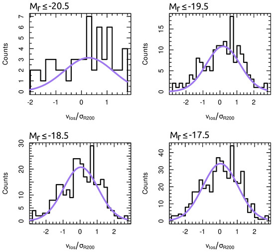 Additionally, we analyze the velocity distribution of galaxies in the central region of the cluster, particularly within , as this type of investigation can reveal crucial information about the system’s internal dynamics and its relationship with the presence of faint galaxies e.g., [34]. This approach becomes even more relevant when considering the impact of galaxy populations with different luminosity limits, which potentially bias the analyses. Figure 6 shows the internal velocity distribution at for each magnitude cut previously considered.