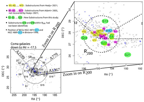 Zoom in of the region bounded by in the RA × DEC plane for the Coma cluster used in this study. The acronyms A1 to A11 (in pink) and H1 to H15 (in yellow) represent the substructures identified by [12,39]. The groups found in this work are represented by S1 to S22 in green. The dashed lines aligned with the center of Coma show the direction of three clusters in its vicinity. X1 and X2 in light blue represent the positions of the BCGs in the [40] study.