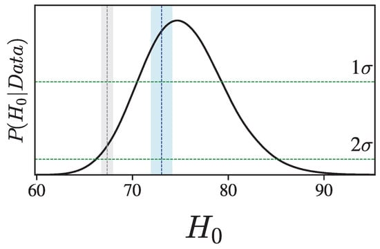The posterior probability distribution function for the free parameter , with a best-fit value of km/s/Mpc at the confidence level. The grey and blue vertical dashed lines represent the estimates from Planck [11] and Riess [4], respectively, along with their corresponding confidence regions. The light green horizontal dashed lines indicate the and confidence levels.