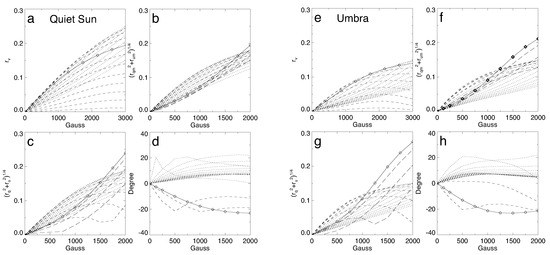 Subfigures a and e Figure 3 respectively show the numerical calculation of Stokes V in the solar model atmospheres of the quiet Sun [42] and the sunspot umbra [43,44] for the FeI 5324.19 Å line. It can be observed that the Stokes V signal in the umbra is weaker than in the quiet Sun under the same magnetic field conditions [28]. This result is consistent with the estimation of the weak field approximation presented above. This may be a noteworthy problem that needs to be carefully analyzed for magnetographs in the future, as it relates to routine observations.