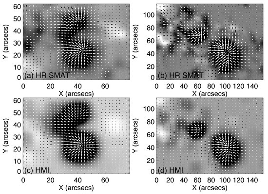Vector magnetograms observed by the Full-Disk Solar Optical and Magnetic Field Monitoring System (SMAT) at the Huairou Solar Observing Station of the National Astronomical Observatory of the Chinese Academy of Sciences on 18 January 2017 (first line) and by the HMI carried by the SDO space satellite (second line) on 3 September 2017. The white (black) color indicates positive (negative) polarity, while the arrows indicate the transverse components of the magnetic field.