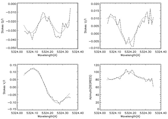 The Stokes polarization spectral distribution of Stokes , , and (dotted lines) for the FeI Å spectral lines obtained in the umbra of sunspots using the Huairou Solar Magnetic Field Telescope compared with the fitted distribution generated by nonlinear least squares inversion (dashed lines). The fourth figure shows the variation of the azimuthal angle of the transverse field inferred from and using the second formula of Equation (9) and neglecting the magneto-optical effect [31].