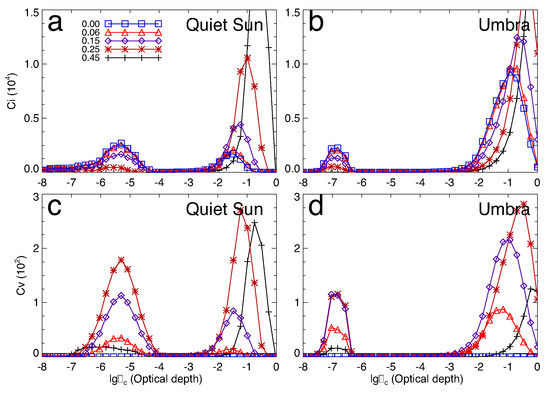 Numerical calculation of the relative contribution functions and of Stokes parameters I and V for the numerical solution of the H4861.34 Å line for the VAL atmospheric model in the quiet Sun by [42] (a,c) and sunspot umbral atmospheric model by [29,53] (b,d) at wavelengths = 0.45 (cross), 0.25 (star), 0.15 (diamond), 0.06 (delta), and 0.0 (black) Å from the H line center. B = 1000 Gauss, = 30°, azimuth = 22.5°, and , while is the continuum optical depth at 5000 Å. The horizontal coordinate is in the logarithmic scale. The calculated data resource is from [28,29].
