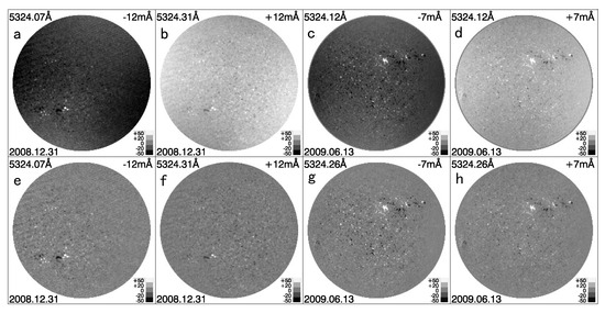 The top panel (a–d) shows the magnetograms before template correction, while the lower panel (e–h) shows the corresponding magnetograms after template correction. The greyscale in the whole picture is limited to 50 Gauss in order to strengthen the display contrast. Note that the crosstalk correction template are the same. Due to different calibration signs, the blue wing magnetogram appears dark before correction, while the red one appears bright. The solar-originated Doppler field affects the magnetic sensitivity and distribution of the calibration coefficients on the full-disc magnetogram of a single wavelength position. Taken from [22].