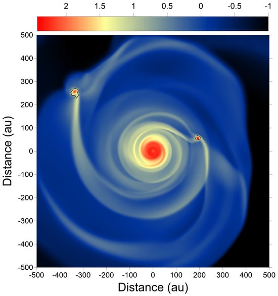 - Vorobyov, E.I.; Elbakyan, V.G. Gravitational fragmentation and formation of giant protoplanets on orbits of tens of au. Astron. Astrophys. 2018, 618, A7. [Google Scholar] [CrossRef]