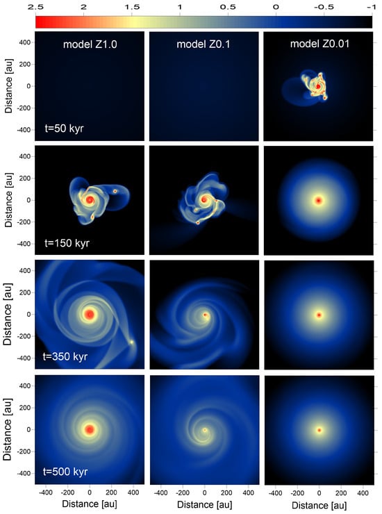 Images of protoplanetary disks at several evolutionary times in the three models considered. The columns from left to right correspond to Models Z1.0, Z0.1, and Z0.01, while the rows present different times since the onset of simulations. Note that in Models Z1.0 and Z0.1, the disk at kyr is yet to form. The scale bar is in log g cm−2.