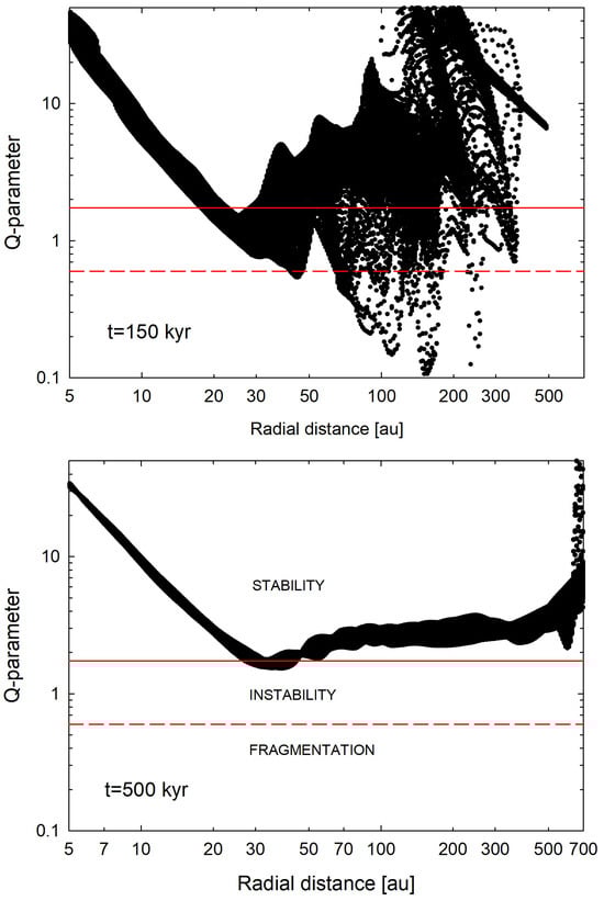 The corresponding values of the Q-parameter are calculated for each computational cell in the considered spatial range. No azimuthal average is applied. The classical Toomre analysis for axisymmetric one-dimensional disks gives a threshold value of . Below this value, gravitational instability develops. However, the stability analysis of thin two-dimensional disks to non-axisymmetric perturbations, which is more relevant to our simulations, yields a critical value for instability of []. Furthermore, disk gravitational fragmentation and clump formation can occur if as the analytical and numerical models of Takahashi et al. [] suggest. Both values are indicated in Figure 3 with the horizontal lines. Clearly, the disk at kyr is prone to both gravitational instability and fragmentation, in agreement with what is seen in Figure 2. However, the disk at kyr is only gravitationally unstable but is not susceptible to fragmentation, in accordance with the disk appearance in Figure 2. Other models reveal similar trends in the Q-parameter.