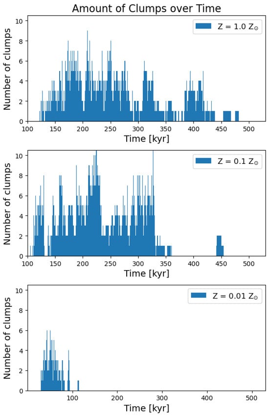 Amount of clumps present in the disk for all three metallicity models. While clumps form for several hundred kyr in the Z⊙ and 0.1 Z⊙ disks, the lowest metallicity disk shows a lot fewer clumps from which most have already vanished after 100 kyr.