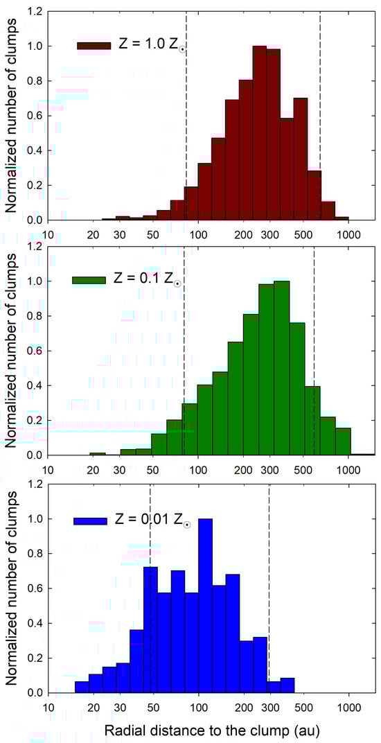 The radial distance to the clumps in the disk is presented in Figure 5 in the form of a normalized distribution function. The normalization in each model is completed so that the peak of the distribution function is equal to unity. The distribution of clumps over distance is rather similar in Models Z1.0 and Z0.1. Most clumps are located in a radial annulus 200–400 au, with a steep decline on the right-hand side from the peak and a shallower slope on the left-hand side. Some clumps are found up to a distance of 1000 au, and these large distances are likely caused by clump–clump gravitational scattering and ejection []. This conjecture is supported by comparing the position of these clumps with the maximum extent of the disk during the fragmentation phase, shown by the vertical dashed lines in Figure 5. For Models Z1.0 and Z0.1, the maximum disk radii are 645 au and 590 au, respectively. The scarcity of clumps at distances au is interesting and may be caused by fast inward migration at these distances, followed by tidal destruction and accretion onto the star. These events manifest themselves in numerical hydrodynamic simulations as accretion and luminosity outbursts [], which are similar in characteristics to FU Orionis-type eruptions []. On the other hand, numerical simulations of a solar metallicity disk with higher numerical resolution () revealed that tidal downsizing of inward-migrating clumps [] can halt their migration at a few tens of astronomical units, followed by the formation of protogiant planets at distances typical for the H8799 system []. Therefore, the number of clumps at tens of astronomical units may be underestimated in our moderate-resolution simulations. The distribution function of the clump’s radial positions in the disk in Model Z0.01 is notably shifted towards smaller values. This is a consequence of a more compact disk in this lowest metallicity model as can be already seen in Figure 2, and also explicitly demonstrated by the dashed vertical lines showing the minimum and maximum disk radii during the fragmentation phase. A smaller number of clumps present at a time in the disk makes clump–clump scattering less effective, although the effect is not completely suppressed, as indicated by a few outliers detected outside the disk’s maximum extent of 295 au. The spatial distribution of clumps in all three models is overall similar, only scaled to the disk size. According to Jin et al. [], gravitational fragmentation in a solar metallicity disk is expected to occur at 20–200 au with the highest probability, at 200–450 au with lower probability, and with lowest probability beyond this distance range. The locations of the clumps in Model Z1.0 are in general agreement with these predictions, considering that clump–clump gravitational scattering can push the bounds to larger distances.