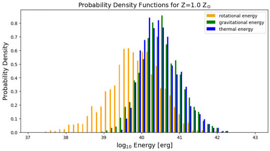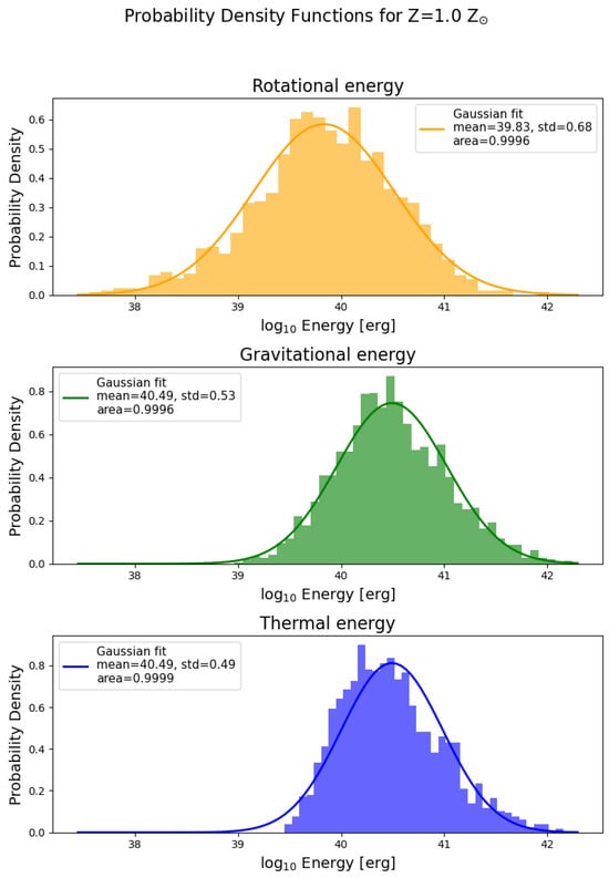 Gaussian fit to each of the probability density functions in Figure 6. The distribution of rotational energy covers a wider range but is shifted to lower values. Also, the distribution’s mean is shifted towards the lower energies. The Gaussian fits to the gravitational and thermal energies indicate their similar input.