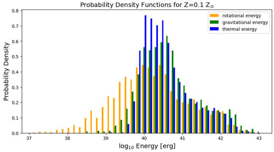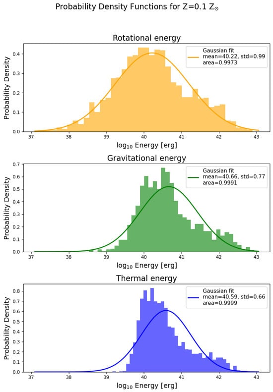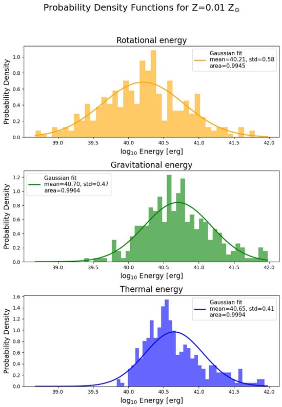 In the case of Z = 0.01 Z⊙, seen in Figure 10, the peaks of the three distributions are much higher compared to the previous metallicities. In turn, they cover a smaller range of energies. The thermal energy shows a peak exceeding a probability density value of 1, but as Figure 11 shows, the area still integrates to a 100% probability. This is because the y-axis only represents the probability density. The rotational energy still dominates the lowest energy values, while thermal and gravitational energy continue to dominate the highest ones. The resolution of the separate probability density histograms in Figure 11 is lower than for the previous metallicity cases. This is because in total, fewer clumps were able to form in the Z = 0.01 Z⊙ disk. The Gaussian of the thermal energy distribution seems to show a misalignment, similar in magnitude to two of the fits in the Z = 0.1 Z⊙ case. The gravitational energy dominates and is balanced by thermal energy and, to a lesser extent, by the rotational energy. The shift between the mean values of and is 0.49 dex, compared to 0.44 dex for Model Z0.1 and 0.7 dex for Model Z1.0. We conclude that the input of rotational energy to support against the gravity of the clump increases for sub-solar metallicity models.