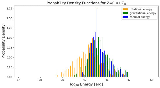 To visualize how the energies are distributed within the clumps, the probability density distribution of thermal, gravitational, and rotational energy is determined for each metallicity case and using all clump realizations shown in Figure 4. This allows us to analyze the extent of each energy’s influence on the clump evolution and their input to a clump’s energy balance. The y-axis is normalized so that the integrated area of each energy histogram is equal to 1.0. For a better comparison, the x-axes are scaled identically for each figure.